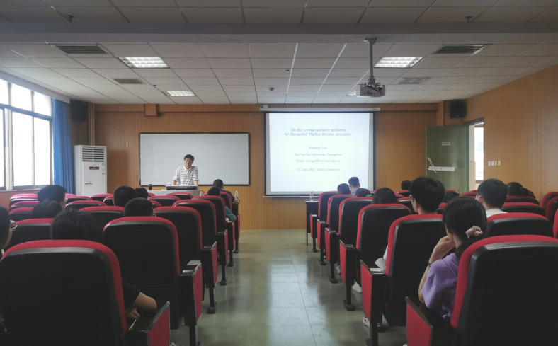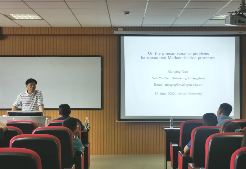 本网讯(通讯员 龙柯宇 邱丽霞 曾昭辉)617日上午,中山大学郭先平教授应邀作客我校 “数学文化节系列学术报告”,在总理楼60605学术报告厅为我校师生作了题为《The g-mean-variance problem for discounted CTMDPs》的精彩报告。此次报告由太阳成集团tyc151cc院长欧祖军主持,太阳成集团tyc151cc师生参加学习。